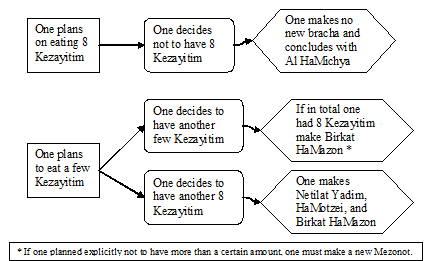 - If one made Mezonot planning to have a few Kezyitim, and then changes to have another few Kezayitim and in total what he ate will add up to 8 Kezayitim one shouldn’t make any new bracha upon changing one’s mind. However, if one started thinking that one would not have more than a certain amount and now clearly changes his mind about that, one should make a new Mezonot. Nonetheless, one concludes with Birkat HaMazon.[13]